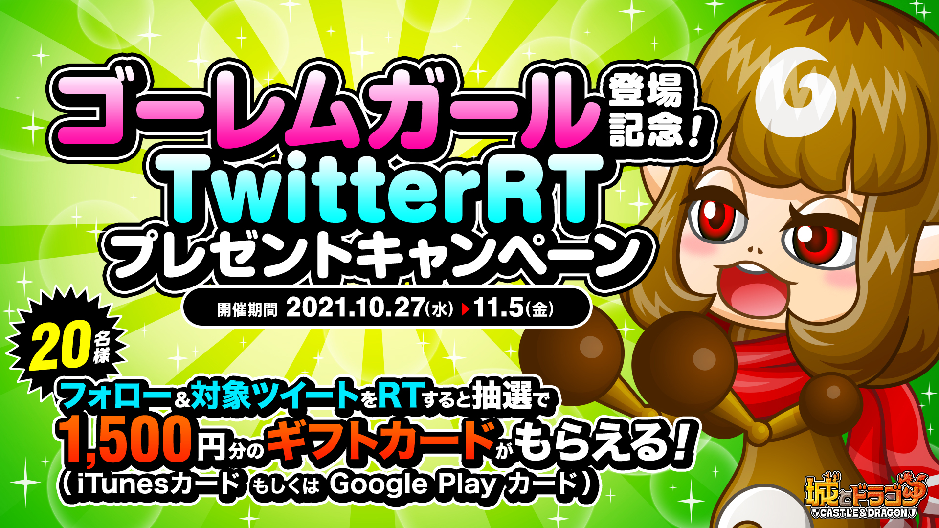 10月27日(水)より「ゴーレムガール」の登場を記念し、「ゴーレムガール登場記念!TwitterRTプレゼントキャンペーン!」をTwitterにて開催いたします。『城とドラゴン』公式Twitterアカウントをフォローし、対象ツイートをリツイートしていただいた方の中から抽選で、1,500円分のギフトカード(iTunesカード or Google Play カード) を20名様にプレゼントいたします。