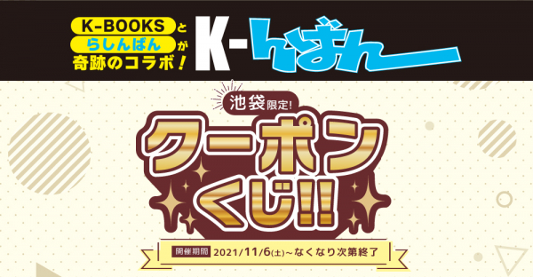 2021年11月6日(土)から、池袋エリアのK-BOOKS・らしんばんにて、最大1,000円引きクーポンが当たるくじ引き(ハズレなし)を実施。