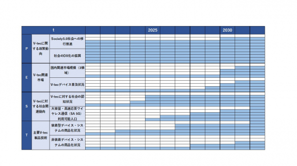 図は政策(P)、経済(E)、社会(S)、技術(T)の4つの代表的な外部環境が今後時間とともにどのように変化していくかを5段階で示した図(t-PESTレーティング )です。青色の占める割合が大きくなるほど、社会浸透が進むことを表します。この図は、2025年頃からV-tecの社会浸透に向けた条件が整い始めることを示しています。
