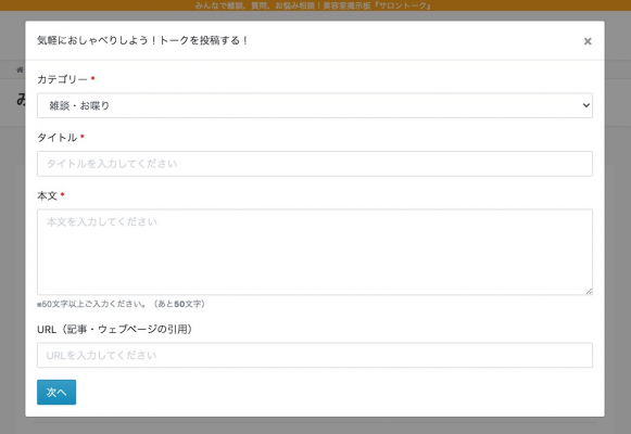 ・「雑談・お喋り」「質問・悩み相談」「ニュース・話題」「髪型・ヘアスタイル」「お店の口コミ・評判」のカテゴリーの中から最も話題に合うものを選択しましょう。