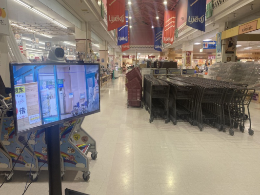 スーパーモールラッキーの5つの出入口にタレット型AIサーマルカメラとモニターが設置されました。