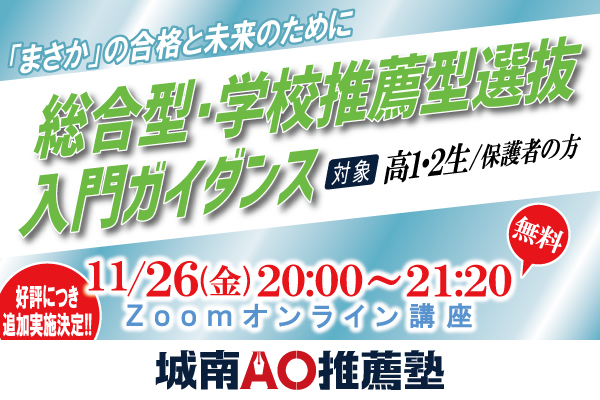 2021年11月26日(金)、株式会社城南進学研究社(所在地:神奈川県川崎市、代表取締役社長CEO:下村勝己)が運営する総合型・学校推薦型選抜対策専門塾「城南AO推薦塾」(塾長:川原洋孝)は、無料オンラインガイダンス「高1・2生対象 総合型・学校推薦型選抜入門ガイダンス」を開催いたします。