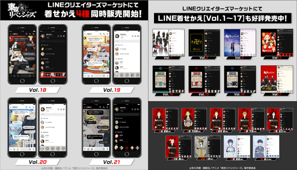 LINEクリエイターズ着せかえランキングで初日に1位を獲得し、その後もランキングTOP20圏内に、多数継続ランクイン中のLINE着せかえVol.1~17に続き、新たに4点の最新作が販売開始!「佐野万次郎×龍宮寺堅×花垣武道」「佐野万次郎」「松野千冬」「佐野万次郎×羽宮一虎」の豪華ラインナップとなっております。是非LINE着せかえでもTVアニメ「東京リベンジャーズ」の世界をお楽しみください。