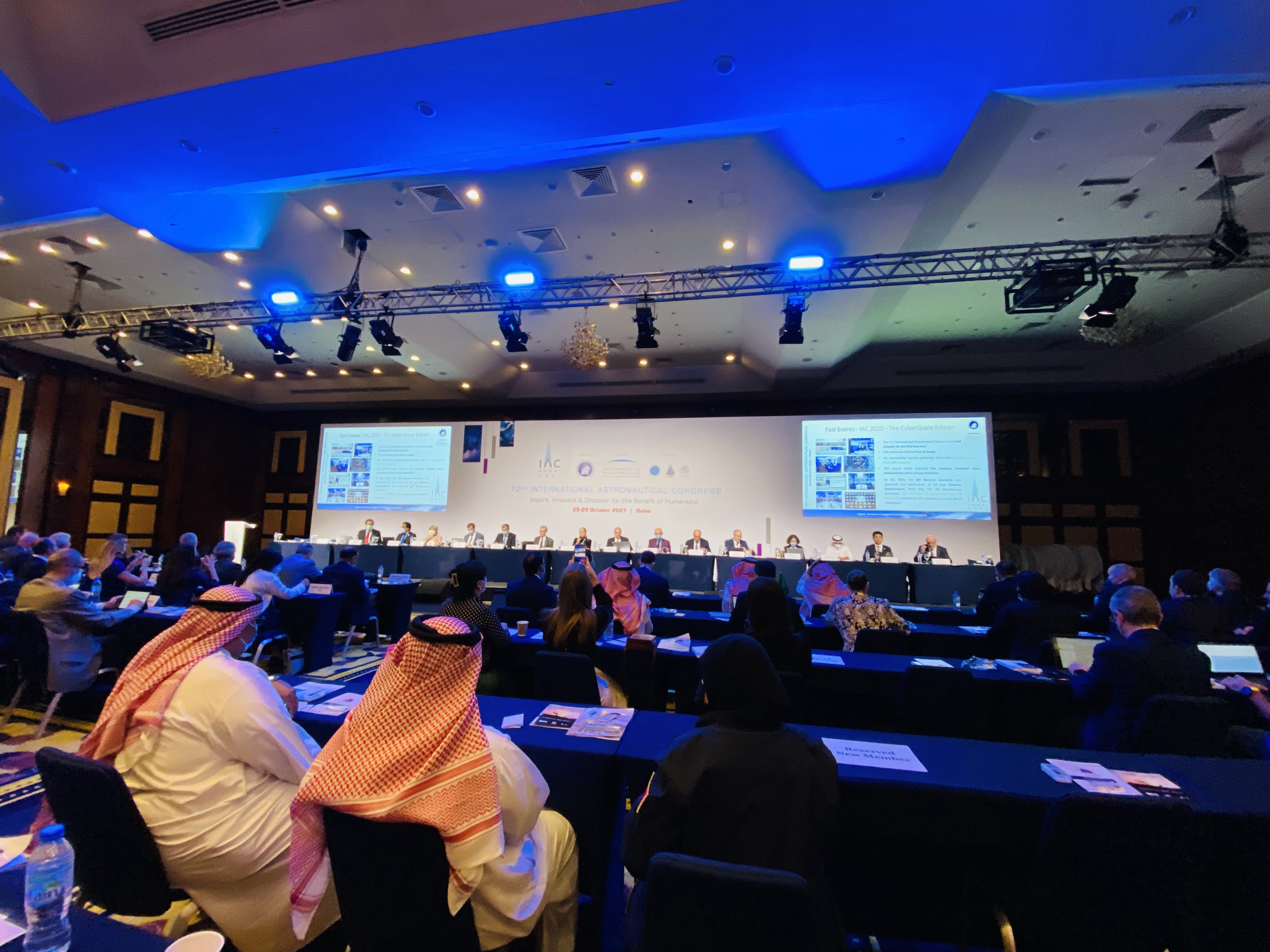 2021年は、10月25日から29日の5日間の会期でモハメド・ビン・ラシッド宇宙センター(MBRSC)がホストを務め、ドバイのワールドトレードセンターで開催されました。110カ国から5,000人以上の参加者が集まり、「Inspire, Innovate and Discover for the Benefit of Humankind(人類の利益のためのインスピレーション、革新、発見)」というテーマのもと多数のプレナリー、テクニカルセッション、スペシャルセッション、IAF GNFパネル、そして90社以上が出展する展示会が行われました。