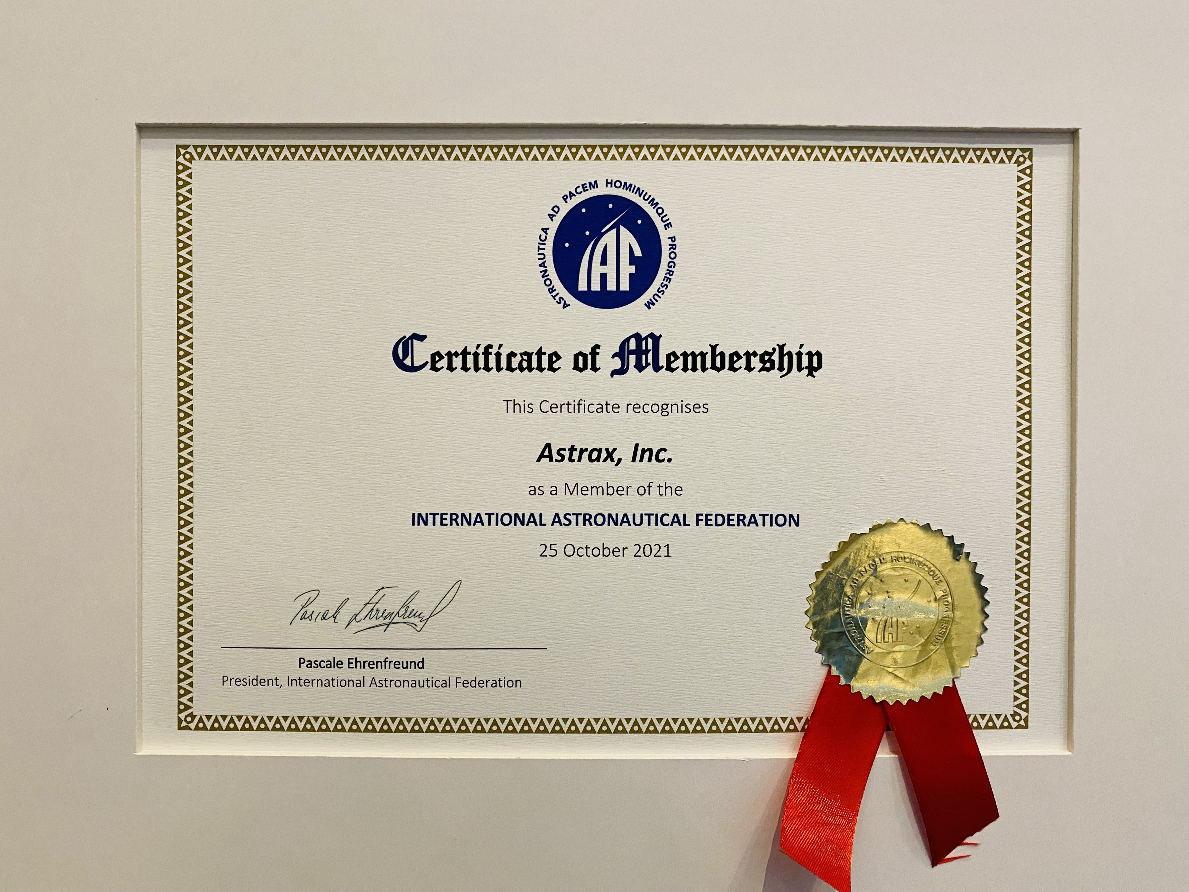 ASTRAXは2021年春頃よりIAFのメンバー加入のための審査を受けておりました。2021年9月には推薦が受けられることが決定され、2021年10月に開催されたIAC 2021のIAF総会において、50の新規IAFメンバーの1つとして正式に承認されました。その結果、IAFは現在73カ国、433の会員を擁する世界最大級の宇宙擁護団体となっています。