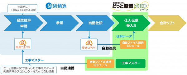 今回新たに「どっと原価NEO」と「楽楽精算」の自動連携サービスを提供することで、「どっと原価NEO」の工事マスターを「楽楽精算」に自動連携し、また「楽楽精算」で登録・処理した経費精算の仕訳データは、工事マスターと紐づいて「どっと原価NEO」に自動連携できるようになります。これまで手作業で行っていたCSVファイルによるデータ連携とは異なり、ファイルの出力やアップロードの手間も不要で人為的ミスを削減し、建設工事の原価に係る経費処理の効率化を実現します。