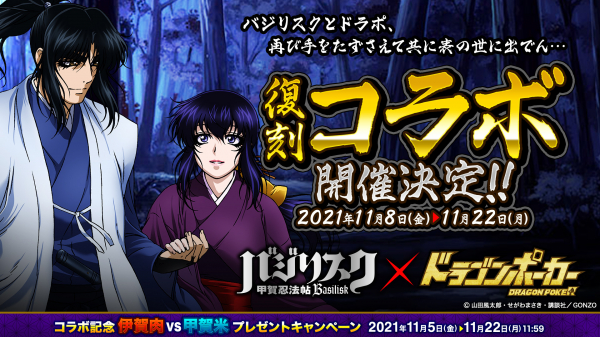 株式会社アソビズム(本社:東京都千代田区、代表取締役:大手智之)は、App Store・Google Playにて好評配信中の『ドラゴンポーカー』とアニメ『バジリスク~甲賀忍法帖~』のコラボを記念して「伊賀肉 vs 甲賀米プレゼントキャンペーン」を、2021年11月5日(金)より実施することをお知らせいたします。
