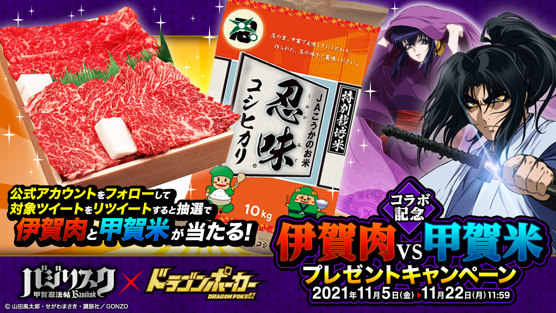 11月5日(金)より、アニメ『バジリスク~甲賀忍法帖~』とのコラボを記念して「伊賀肉 vs 甲賀米プレゼントキャンペーン」を実施いたします。『ドラゴンポーカー』公式Twitterアカウントをフォローし、対象ツイートをRTしていただいた方の中から抽選で伊賀牛、甲賀米などが当たるチャンス!?キャンペーンへのたくさんのご参加お待ちしています!
