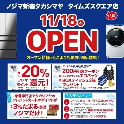 株式会社ノジマ(神奈川県横浜市、代表執行役社長・野島廣司)は、2021年11月18日(木)に【ノジマ 新宿タカシマヤ タイムズスクエア店】をタカシマヤ タイムズスクエア 本館11階にオープンいたします。新宿地域には初出店となります。