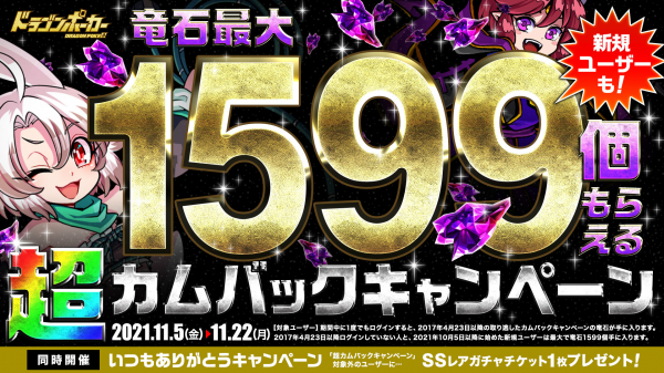 2017年4月23日以降に実施されたカムバックキャンペーンにて、ログインせずに受取れなかった竜石がまとめて手に入ります。2017年4月23日以降のカムバックキャンペーン期間中、ログインしていないユーザーに、最大で竜石1599個をプレゼント!さらに、2021年10月5日以降にドラゴンポーカーを始めたユーザーにも竜石1599個プレゼント!これを機会に、ドラゴンポーカーにログインして大量の竜石をGETしましょう!