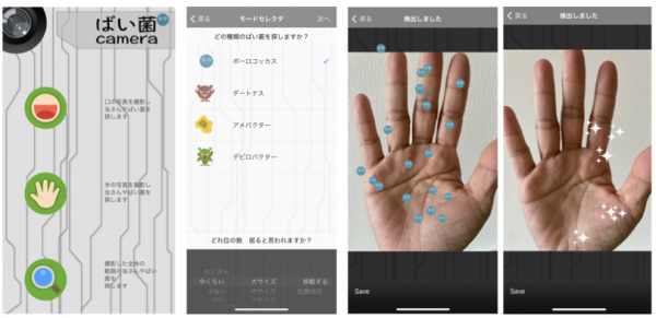 「ばい菌カメラ」は撮影した手や歯に、本当にそこにばい菌がいるかのように表示させ、子どもに手洗い/歯磨きを促すことを手助けするアプリです。