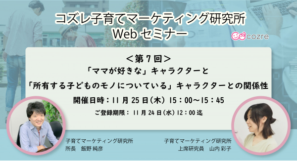 株式会社コズレの社内シンクタンク「子育てマーケティング研究所」は、2021年11月25日(木)に、子育て世代向けマーケティングWebセミナー「『ママが好きな』キャラクターと『所有する子どものモノについている』キャラクターとの関係性」を開催することを本日、お知らせいたします。