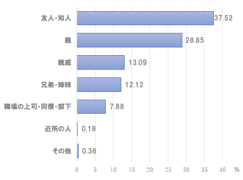 本調査の有効回答者2,073名のうち、出産祝いをもらった経験があるママ1,650名に、人生で初めてもらった出産祝いの相手について聞いたところ、「友人・知人にもらった」と回答した割合が37.52%と最も多かった(図1)。