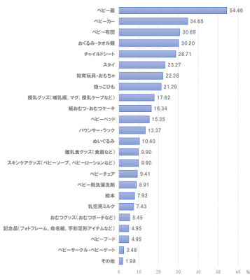 ベビー服がもっとも贈られる点は全体の結果と同じであるが、ベビーカーやベビー布団、チャイルドシートなどの大型商品や高額商品が上位にくるという結果がおもしろい。