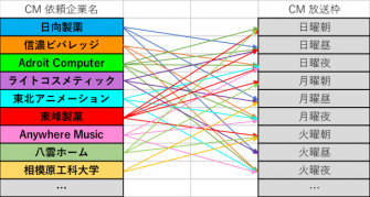 メタデータ株式会社(所在地:東京都文京区;代表取締役社長:野村直之)は、スポットTV CMの割付けを超高速で行う新製品xTech for TV CM (https://metadata.co.jp/xtech-for-tvcm.html) を本日提供開始しました。マッチ数に比例する超高速度で多数対多数を適切にマッチングさせるとともに、スポンサー、曜日や時間帯によって条件が動的に変わる場合でもコードを変更することなく対応し、人間の作業量を1,2桁削減。さらに前後の番組との相性改善によりCM視聴率、ひいては対象商品の購買率向上につながる、優れたマッチング結果につながります。クラウドサービスまたは、各地方TV局のTV CM割付け(=作案)作業のコスト削減により3年以内に投資回収できる対価で営放システムに組み込む形のオンプレミス形式で提供いたします。