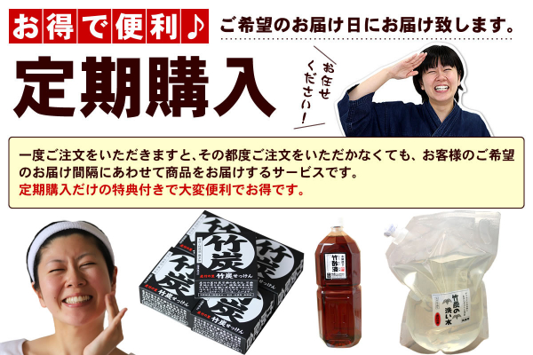 虎斑竹専門店 竹虎本店では定番商品の竹炭の洗い水、竹酢液、竹炭石鹸の定期購入をご利用いただけます。今までは送料半額でお届けしていましたが、2021年11月8日以降より新規ご契約のお客様を対象に送料無料(北海道・沖縄は送料50%OFF)でお届けいたします。