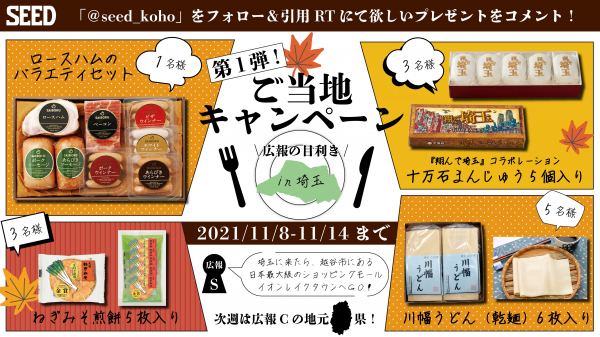 当キャンペーンは、株式会社シード広報担当(公式)Twitterアカウント「@SEED_koho」(以下、「当公式アカウント」)をフォローいただき、該当ツイートの引用RTに欲しいプレゼントをコメントしていただいた方の中から抽選で、「ロースハムのバラエティセット」を1名、「十万石まんじゅう5個入り」を3名、「ねぎみそ煎餅5枚入り」を3名、「川幅うどん(乾麺)6枚入り」を5名にプレゼントいたします。併せて、当公式アカウントではキャンペーン期間中に当社埼玉エリア営業担当者や広報担当者が地元の魅力やコンタクトレンズ情報等をお届けする予定です。当社はこれからも、キャンペーン等を通じて皆さまの「見える」をサポートしてまいります。