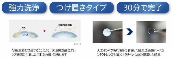 「コレクトクリーン」は酸素透過性ハードコンタクトレンズ用タンパク洗浄液となり、毎日のお手入れでは除去しきれない