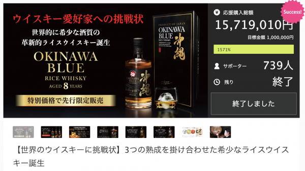 久米仙酒造株式会社(本社:沖縄県那覇市、代表取締役:比嘉洋一)は、「熟成し続ける」希少な酒質のライスウイスキー 『沖縄 BLUE 8年』を2021年11月1日(月)より一般販売スタートしました。同商品は、クラウドファンディングサイト『Makuake(マクアケ)』でのプロジェクトで15,719,010円の応援購入を獲得。商品先行販売プロジェクトとしては2021年11月9日時点で国内の蒸留酒業界(ウイスキー業界含め)No.1の実績を持つ商品となりました。