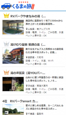 車で旅するすべての人に向けて、行き先提案をするメディア「くるまの旅ナビ」を運営するキャンピングカー株式会社(本社:東京都渋谷区、代表取締役:頼定 誠)は、車中泊旅の流行を受け、温泉を楽しむことができる車中泊スポット(RVパーク)のランキングを発表致しました。