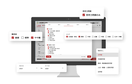 同サービスにより、膨大な書籍から時間をかけて問題を探す負担を軽減し、検索項目をチェックするだけで、使いたい問題がすぐに見つかるようになります。
