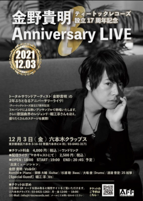 株式会社ティートックレコーズ(本社:東京都渋谷区)は2021年12月3日(金)代表でトータルサウンドアーティストの金野貴明によるアニバーサリーライヴを開催いたします。