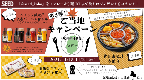コンタクトレンズの製造販売を行う株式会社シード(本社:東京都文京区、代表取締役社長:浦壁 昌広、東証1部:7743)は、2021年11月8日(月)~12月5日(日)の間、シード公式Twitterにおいて、『ご当地キャンペーン』を開催いたします。シード公式Twitterをフォロー&引用RTしていただいた方の中から抽選で、当社広報担当者4名の出身地オススメの食べ物をプレゼントいたします。第2弾は広報Cの出身地、岩手県です。