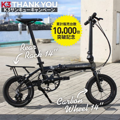 株式会社アキボウ(本社:大阪府堺市 代表取締役社長:西木 一彦)は、DAHONの人気モデル「K3」の累計販売台数が10,000台を突破したことを記念して、K3にカスタム装着が可能なアイテムを期間限定でお買い得にご購入いただけるキャンペーンを2021年11月20日(土)から2022年1月16日(日)まで実施いたします。