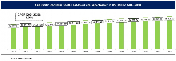 アジア太平洋地域(東南アジアを除く)のサトウキビ砂糖市場は、2017年の68037.91百万米ドルから、2030年末までに88303.00百万米ドルの収益を獲得すると予測されています。