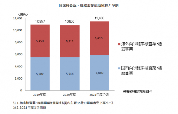2021年度の国内主要企業における臨床検査薬・機器事業規模(臨床検査薬・機器事業を展開する国内主要35社の事業者売上高ベース)は、国内向けが前年度比6.1%増、海外向けは同5.6%増、あわせて同5.8%増の1兆1,490億円になると予測する。2021年度の前半で一般的な医療の検体検査数は前年度比プラスに転じてきている。また2021年夏場の新型コロナウイルス感染拡大に伴い、同検査薬需要は急拡大した。2021年度下期以降、新型コロナウイルスの検査数は沈静化の方向に向かうと見られるが、通年で捉えた場合の臨床検査薬・機器業界としての底上げ幅は比較的大きくなると推測される。