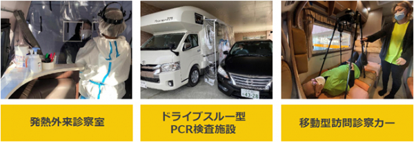 コロナ禍という特殊かつ変化していく医療分野の需要において各自治体や医療機関と連携し、迅速にニーズに対応してきました。キャンピングカー車両をベースとする事で、機動性や利便性を活用した『発熱外来患者向けの診察室』、『ドライブスルー型PCR検査施設』、『移動型ワクチン接種カー』など多数の実績があります。