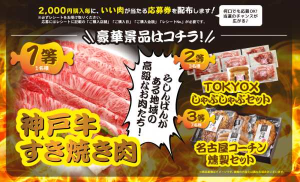 神戸牛をはじめ、らしんばんのお店がある地域の高級肉をご用意いたしましたので、奮ってご応募ください!