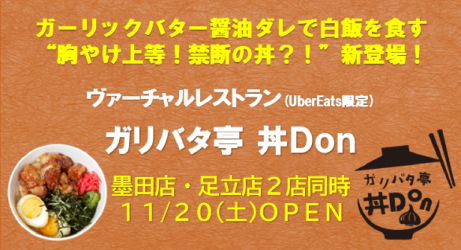 東京・墨田区と足立区でスープカレー専門店「お江戸スープカレーちゃはや庵」「東京スープカレーCahaya」を運営する有限会社マジカルエッグ(本社:東京都足立区、代表取締役:高山昌之)は、2021年11月20日(土)午前11時、ヴァーチャルレストラン「ガリバタ亭丼Don」を墨田区と足立区で2店同時オープンします。「ガーリックバター醤油ダレで白飯を食らう」をコンセプトに掲げ、フードデリバリーサービス「Uber Eats」(ウーバーイーツ)限定で販売する、新サービスです。