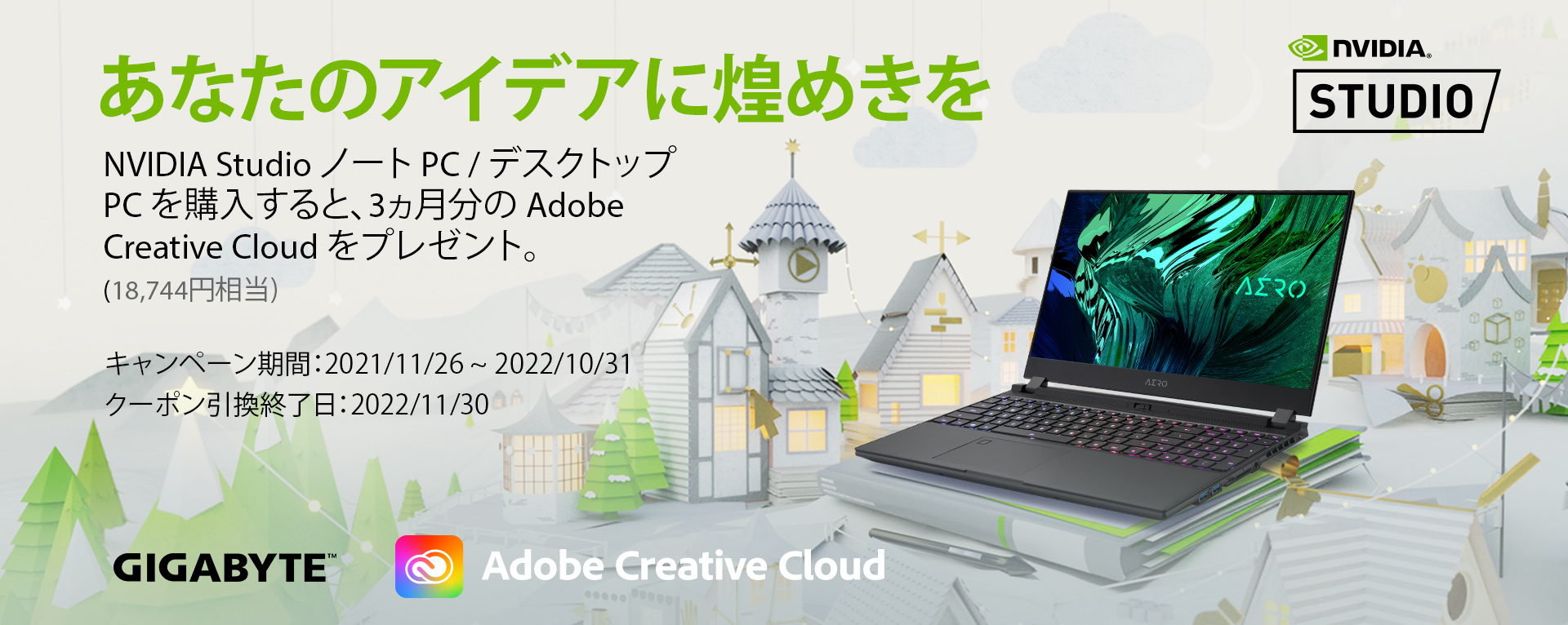 2021年11月26日 - GIGABYTE Technology Co., Ltd. 台湾・新北市 - コンピュータテクノロジーで世界をリードするGIGABYTE Technologyは、2021年11月26日~2022年10月31日の期間中、クリエイター向けノートPC「AEROシリーズ」のNVIDIA RTX Studio準拠モデルをご購入いただいた方に、Adobe社のクリエイティブアプリケーション統合版「Adobe Creative Cloud」が3カ月使用できるクーポンコードをもれなくプレゼントするバンドルキャンペーンを実施いたします。