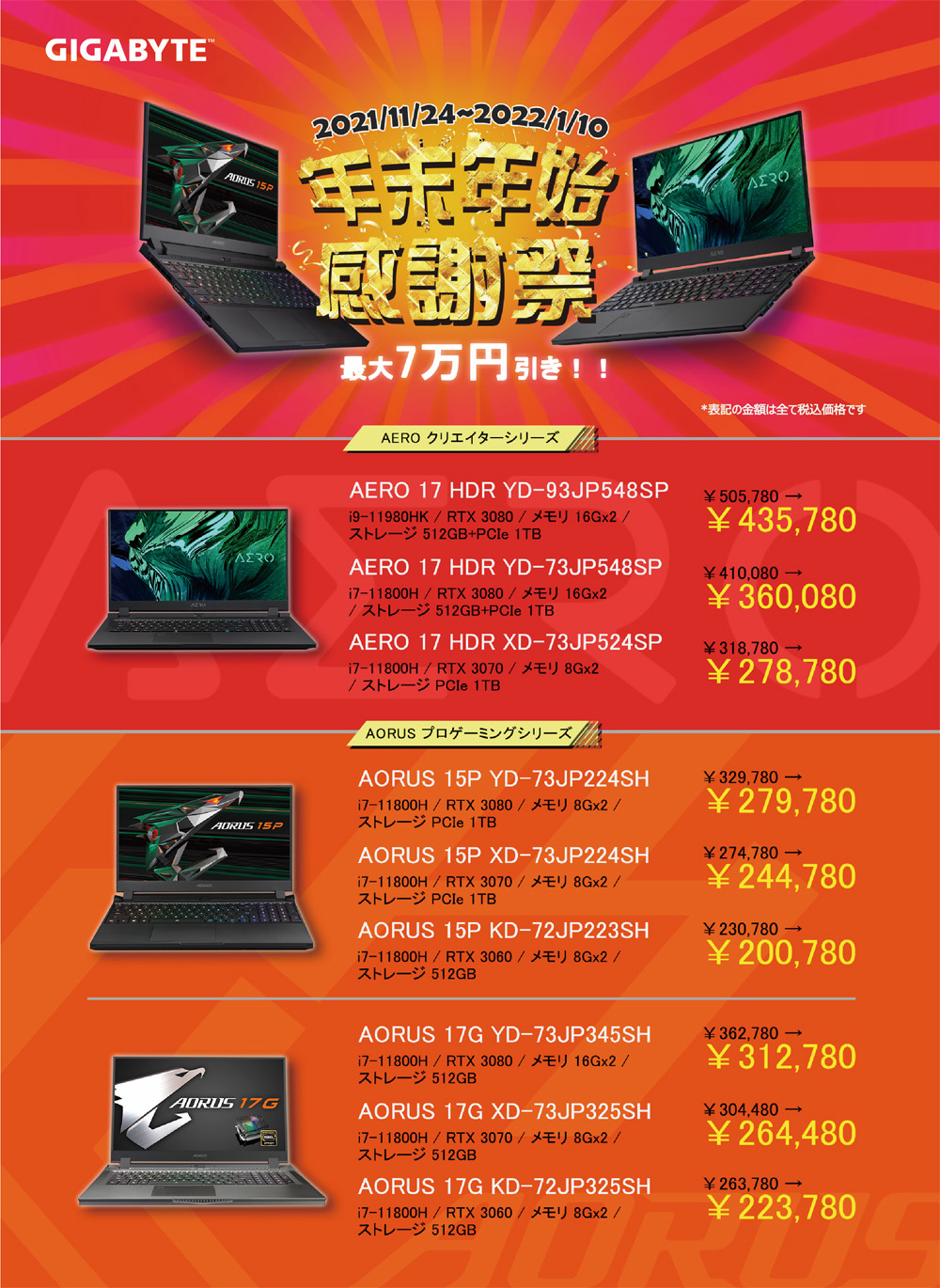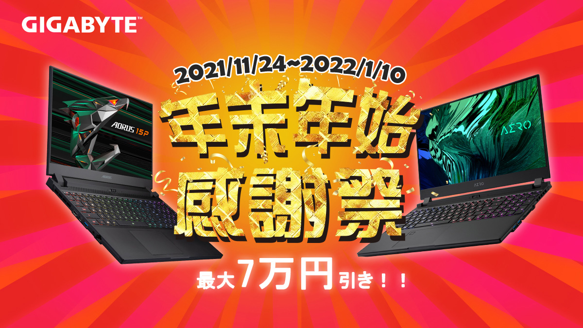 2021年11月24日 - GIGABYTE Technology Co., Ltd. 台湾・新北市 - コンピュータテクノロジーで世界をリードするGIGABYTE Technologyは、日頃のご愛顧への感謝をこめて、2021年11月24日~2022年1月10日の期間、クリエイター向けノートPC「AEROシリーズ」およびゲーミングノートPC「AORUSシリーズ」が最大70,000円引きでご購入いただける「年末年始感謝祭」セールを全国のGIGABYTEノートPC正規取扱店にて実施いたします(店舗によって、取り扱いのないセール対象製品もございます)。