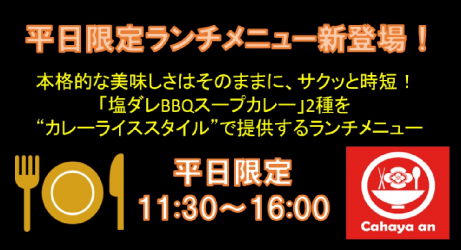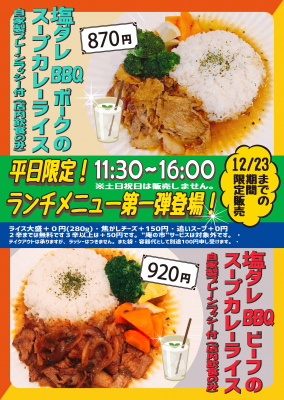 有限会社マジカルエッグ(本社:東京都足立区、代表取締役:高山昌之)が東京・墨田区で運営している店舗「お江戸スープカレーちゃはや庵」は、2021年11月25日(木)から12月23日(木)まで、平日限定のランチメニューとして、スープとカレーを別盛りとしない「スープカレーライス」の販売を新たに開始します。メニューは「塩ダレBBQポークのスープカレーライス」と「塩だれ BBQビーフのスープカレーライス」の2種類で、店内飲食の場合は、自家製プレーンラッシーを無料でお付けします。