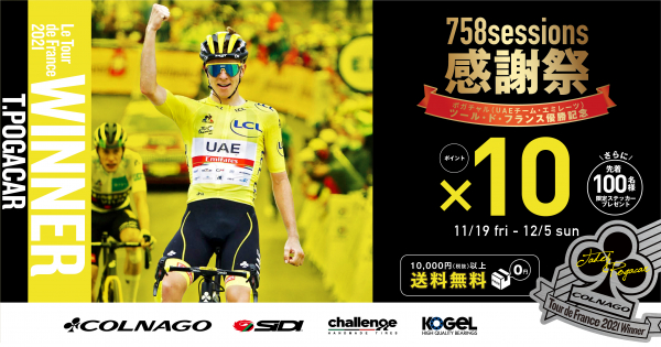 COLNAGO(コルナゴ)の正規代理店である株式会社アキボウは、ツール・ド・フランス2021で昨年に続き総合優勝を獲得したポガチャル選手(UEAチーム・エミレーツ)の2連覇を記念して「758sessions感謝祭」を実施します。COLNAGOの公式オンラインショップで、購入時の進呈ポイントが10倍に!さらに限定ステッカーのプレゼントや、期間限定の特別セール品をラインナップいたします。