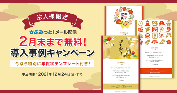 月額900円からはじめるメール配信システム「さぶみっと!メール配信」の全プランについて、新規でご利用いただく企業の方を対象に、2021年12月24日(金)までのお申込みで、2月末まで無償でご提供させていただきます。今すぐ使える年賀状テンプレート付きです!