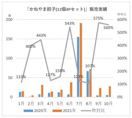 今年に入ってから、この『かねやま餃子(12個4Pセット)』の販売は好調を博し、2021年はこれまで10カ月間連続で昨年比100%超えを継続。10月末までの販売総数は、昨年の約1.5倍となっています。