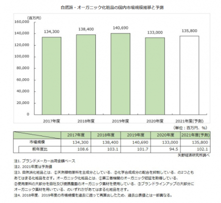 2021年度は首都圏や大都市圏を中心に断続的な緊急事態宣言下にあったが、下期に入り収束の兆しが見えてきたことで回復が期待される。また、社会におけるサスティナブルやSDGsへの関心の高まりは、自然派・オーガニック化粧品市場には追い風とみる。