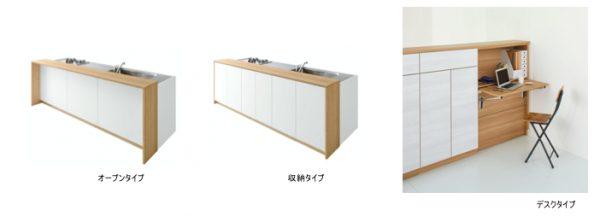 対面側は主に 3 タイプ。特にデスクタイプは、テレワークや、補助カウンター等、多目的な使用が可能。 各キャビネットの組み合わせも可能です。