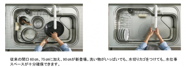 作業中の水流でシンク内の細かなゴミも集めて排水口へ流す「流レールシンク」に間口 90 cmのワイドタイプ型が新登場。