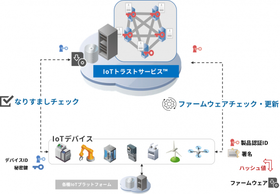 ブロックチェーン技術を応用した電子証明システムにより、運用中の IoT デバイスおよびファームウェアに、なりすましや改ざんが行われていないか定期的にチェックし正当性を証明します。OTA(無線経由)によるファームウェアの自動更新も可能です。