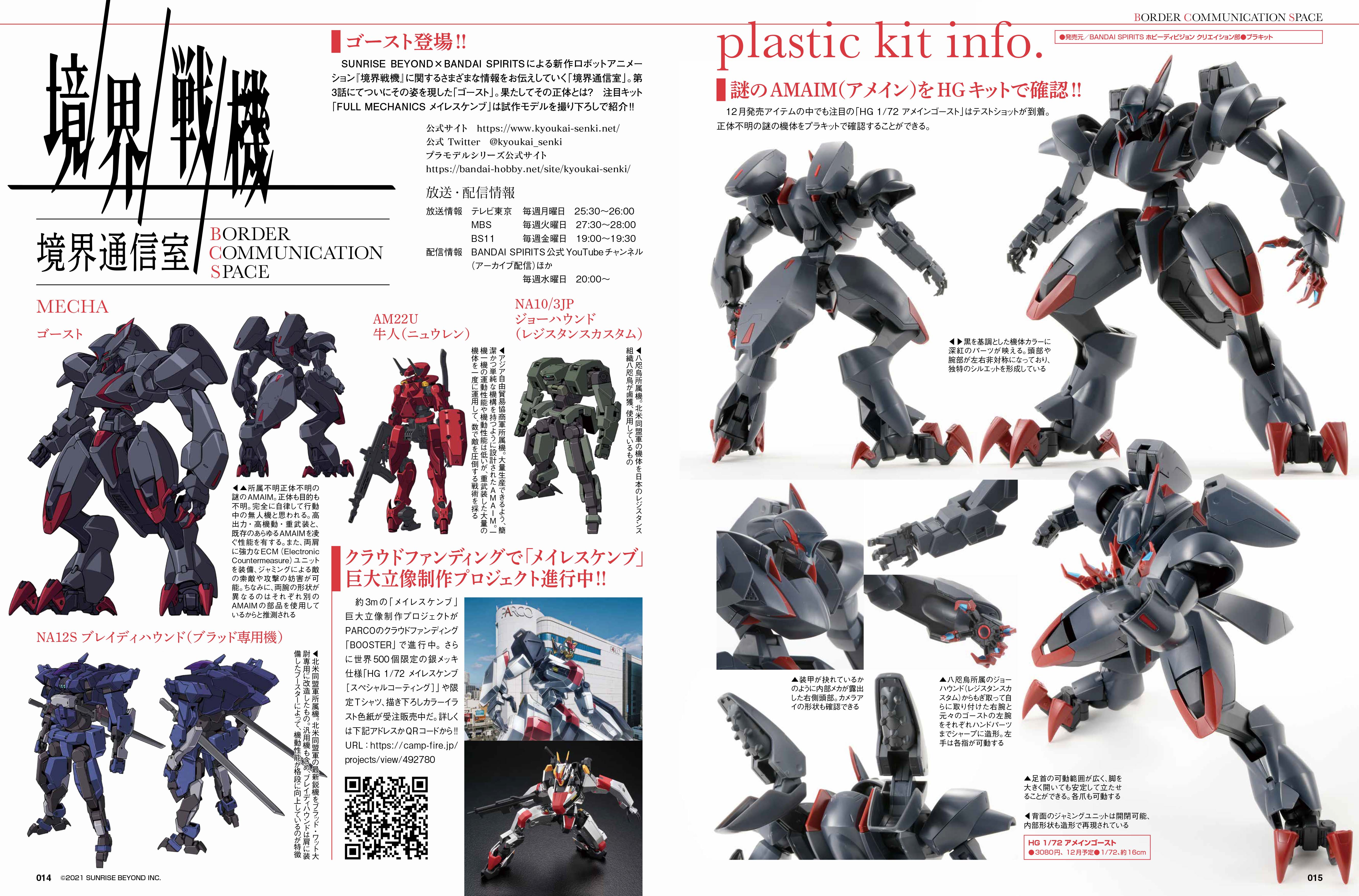 アニメ『境界戦機』では、「HG 1/72 アメインゴースト」「FULL MECHANICS 1/48 メイレスケンブ(初回限定クリア外装付き)」の最新情報を紹介。