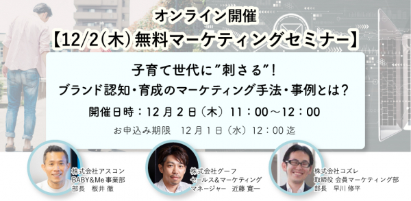 株式会社コズレ(本社:東京都千代田区、代表取締役:田中 穣二郎、以下コズレ)は、株式会社グーフ(本社:東京都品川区、代表取締役:岡本 幸憲、以下、グーフ)及び、株式会社アスコン(本社:広島県福山市、代表取締役:中原 貴裕、以下、アスコン)と、2021年12月2日(木)に、子育て世代向けマーケティングWebセミナー「子育て世代に”刺さる”!ブランド認知・育成のマーケテイング手法・事例とは?」を共催することを本日、お知らせいたします。