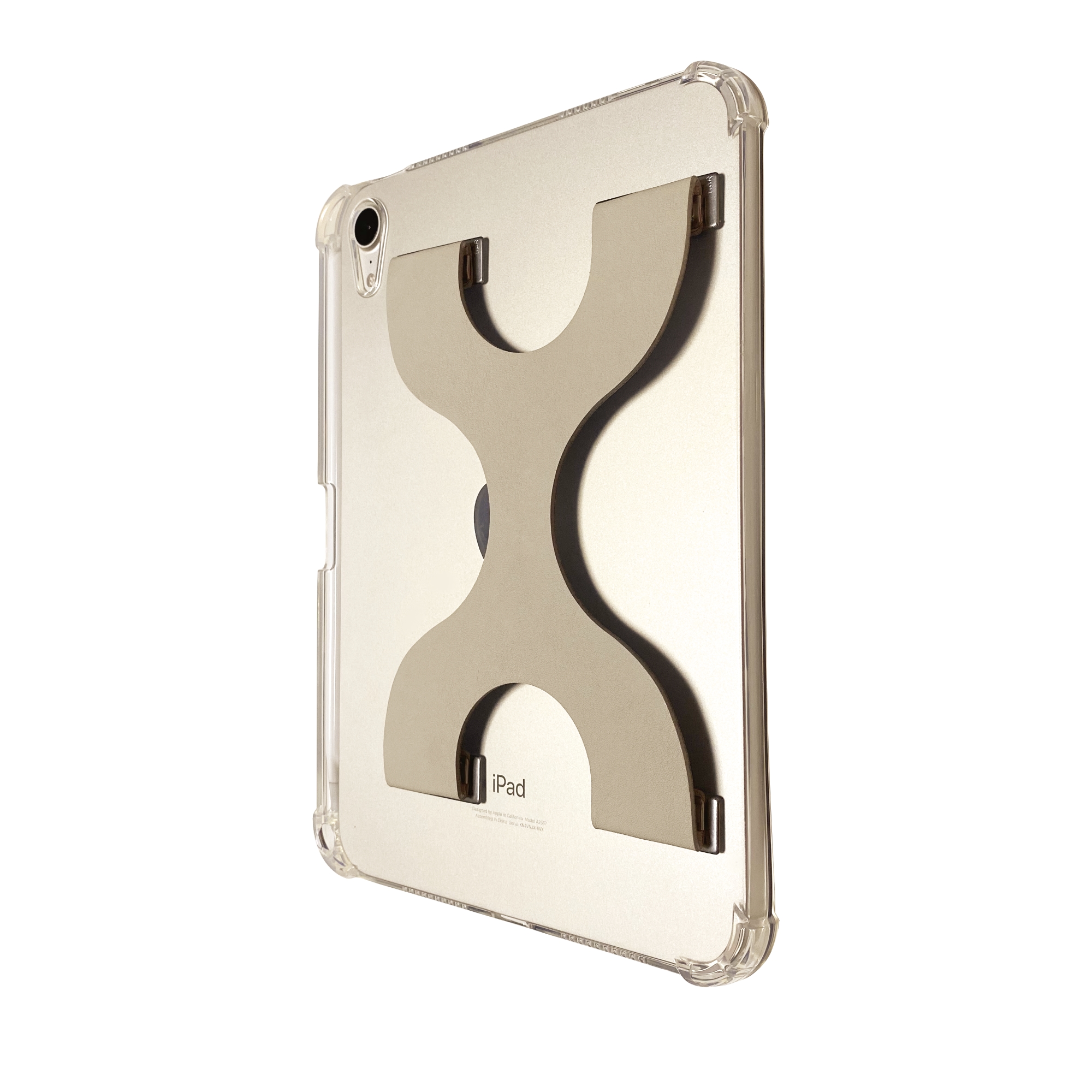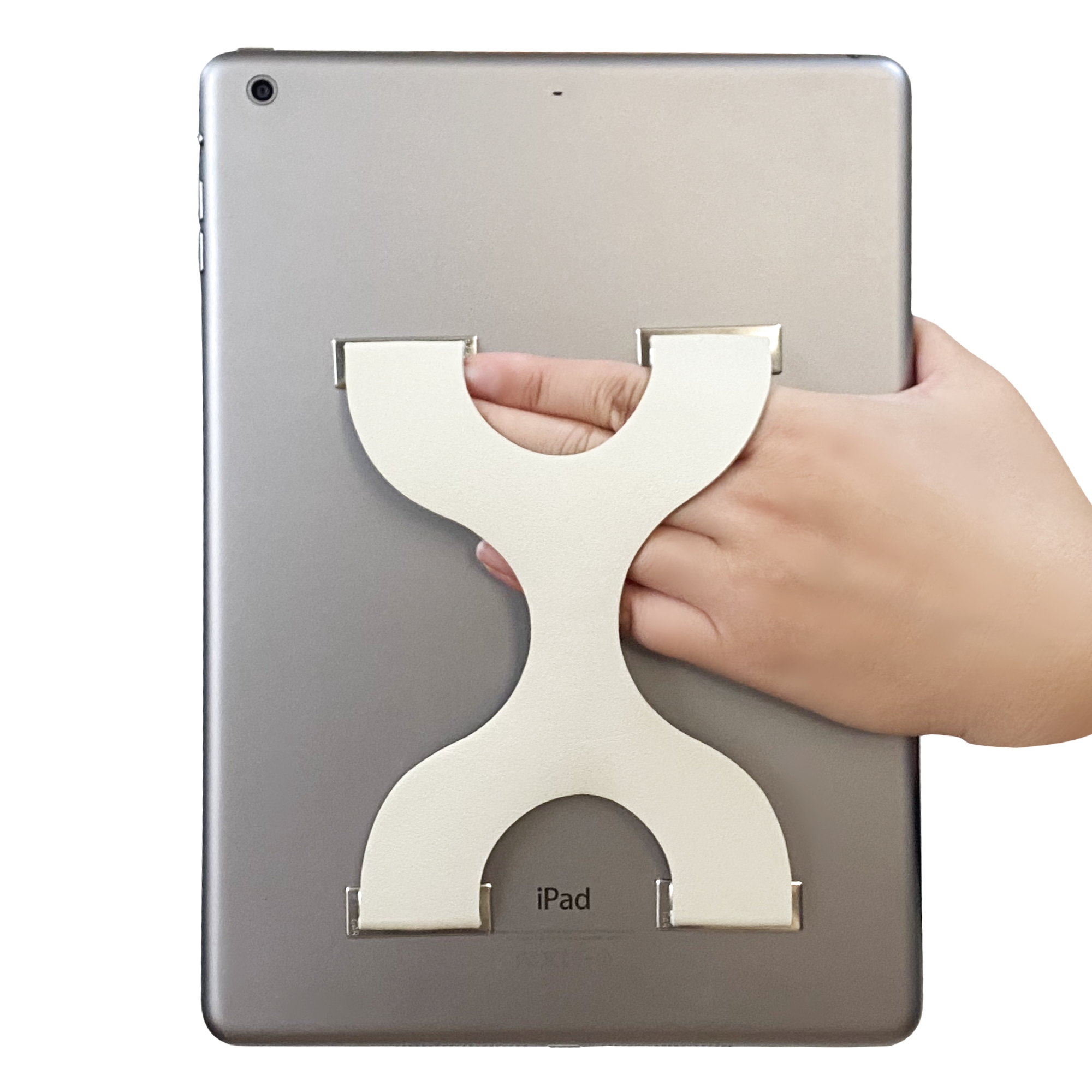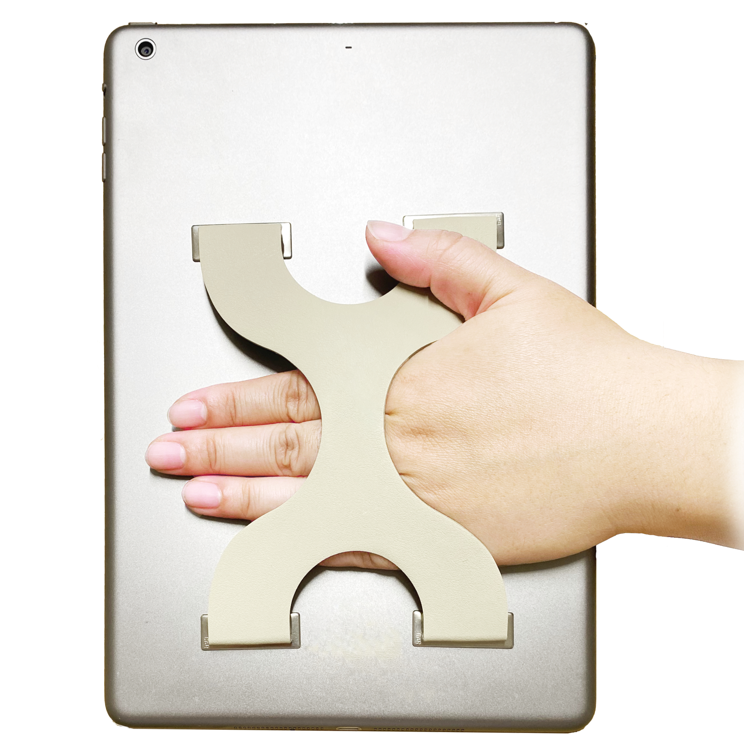 タブレット端末は背面の面積が大きく、短辺と長辺があり、縦持ち、横持ち、相手に見せるための反転など、様々な姿勢での操作を想定しなければならず、単純な形状では対応できません。「SMA-BELT TAB」は縦長に描かれたX字型の形状を取ることにより、ディスプレイサイズ11インチのデバイスを基準に、四辺のいずれ側から指を伸ばしても指を通すことができるように設計されています。