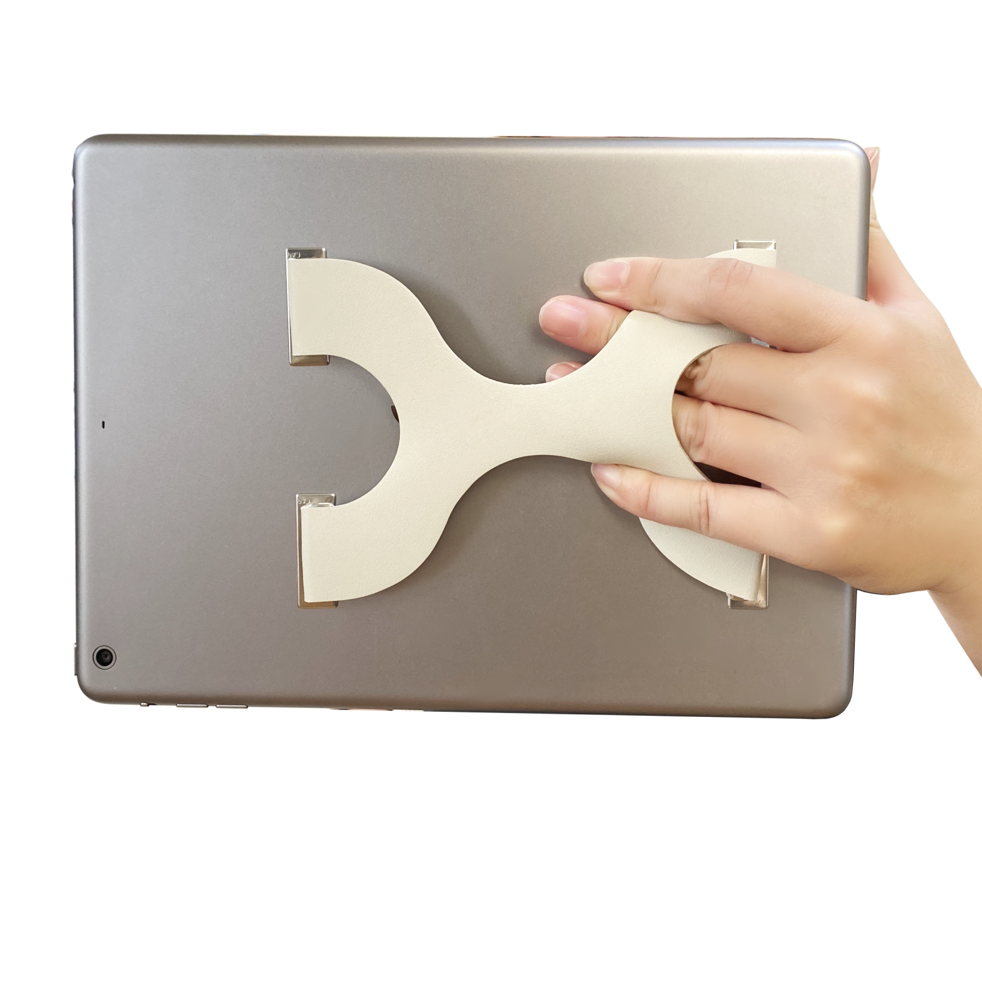本製品は、SMA-BELTと同様に、デバイスやケースの背面に粘着テープで固定するベルトです。強力な粘着テープで固定された合皮ベルトに手を差し入れたり、ベルトを掴んだりすることで、タブレット操作を安定させます。