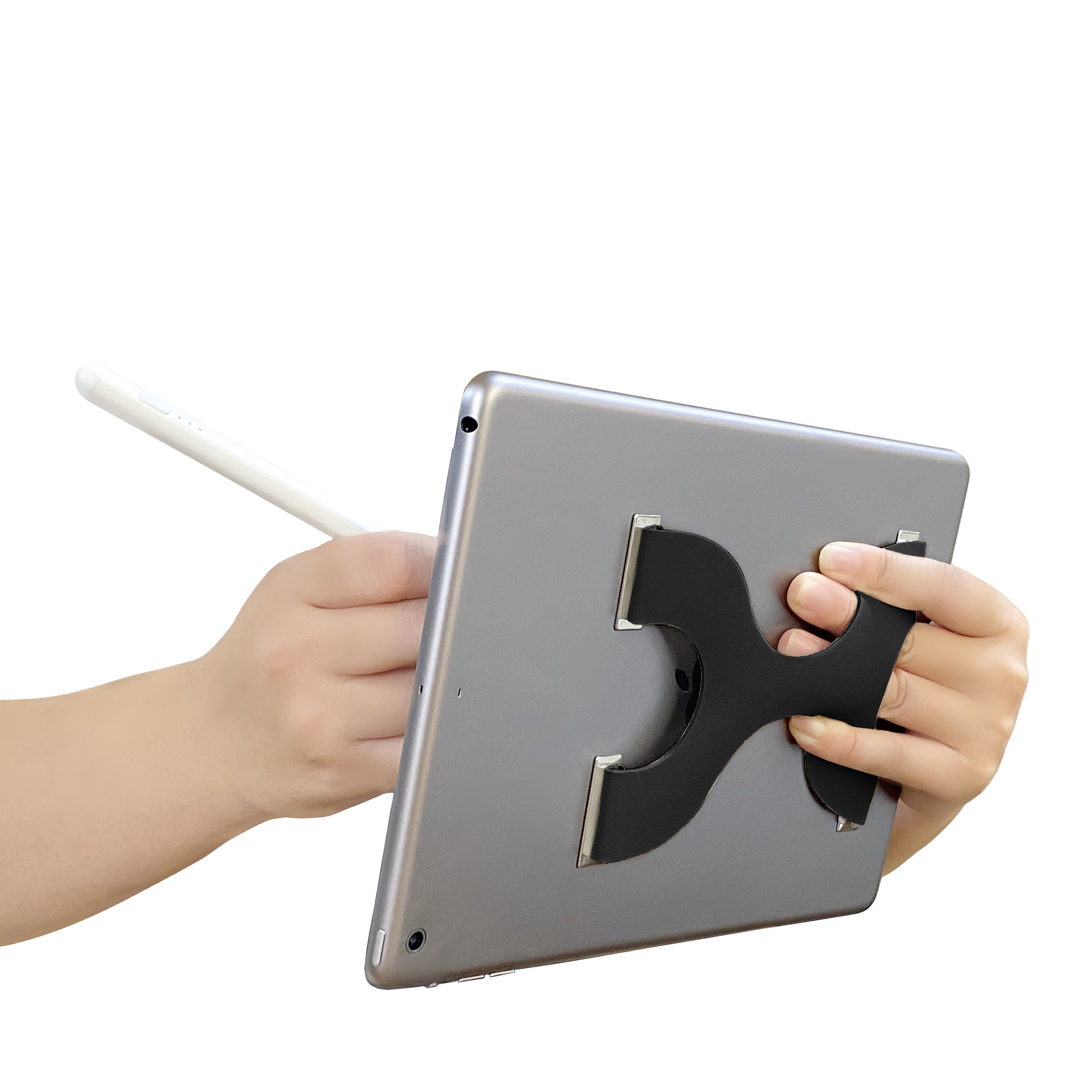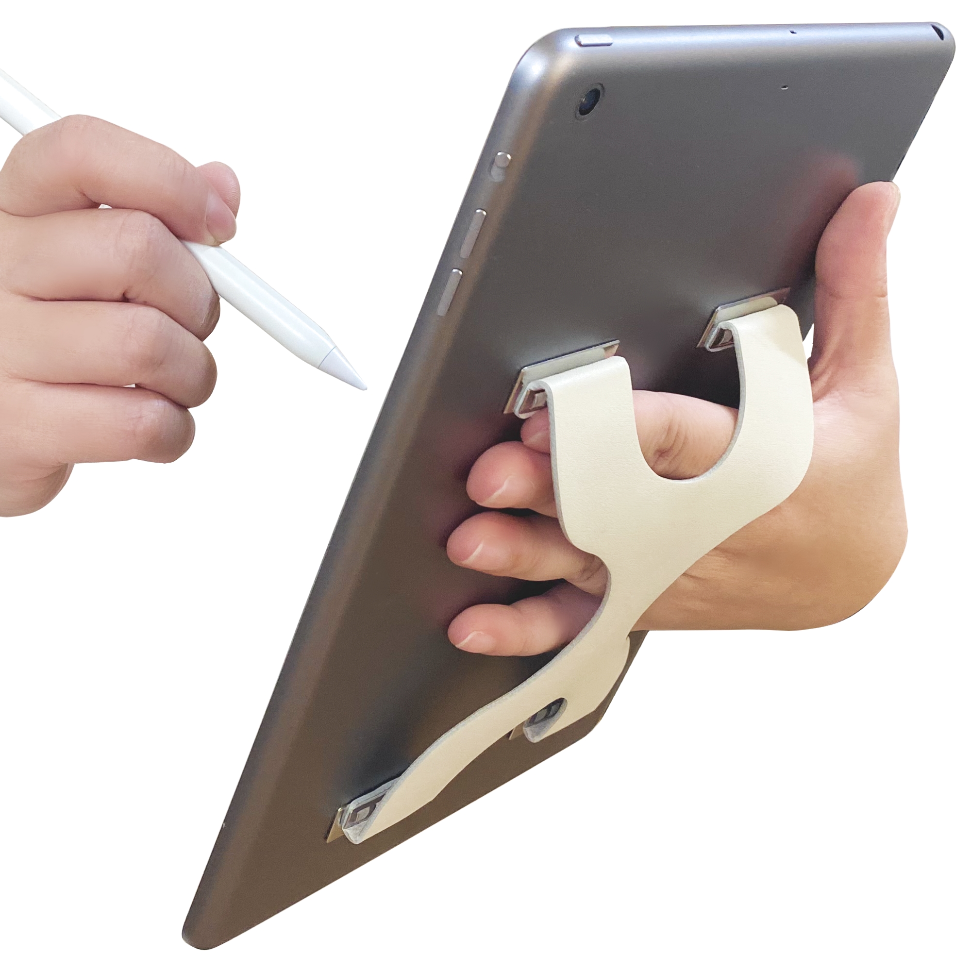 これまでタブレット端末にはSMA-BELTは使用できませんでした。一方で、タブレットではペン入力が普及し、従前とは違って、片手操作が必要となる場面が増えています。ほんのわずかな時間でも、てのひらでは掴みきれないタブレットを片手操作することは大きなリスクを伴います。
