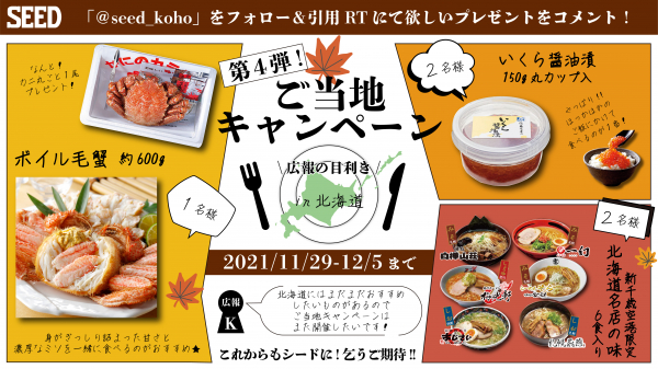 当キャンペーンは、株式会社シード広報担当(公式)Twitterアカウント「@SEED_koho」(以下、「当公式アカウント」)をフォローいただき、該当ツイートの引用RTに欲しいプレゼントをコメントしていただいた方の中から抽選で、「ボイル毛蟹 約600g×1尾」を1名、「いくら醤油漬 150g丸カップ入」を2名、「新千歳空港限定 北海道名店の味 6食入り」を2名にプレゼントいたします。併せて、当公式アカウントではキャンペーン期間中に当社北海道エリア営業担当者や広報担当者が地元の魅力やコンタクトレンズ情報等をお届けする予定です。当社はこれからも、キャンペーン等を通じて皆さまの「見える」をサポートしてまいります。