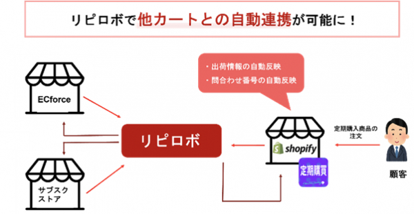 今回の連携では、Shopifyアプリ「定期購買」で作成した二回目以降の注文情報もリピロボで受け取ることが可能で、Shopifyでの定期購入がリピロボで利用できるようになる連携となります。